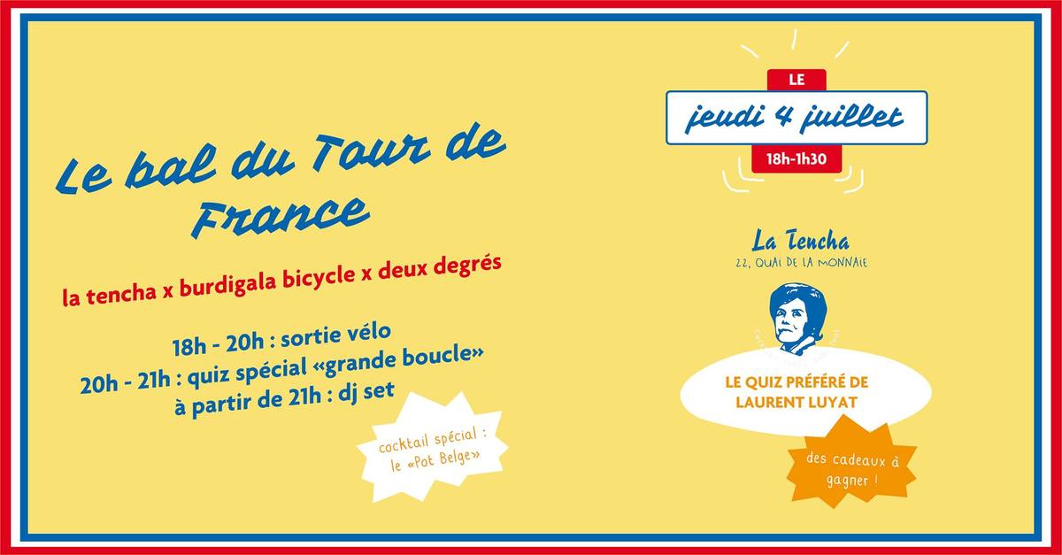 Que tu sois féru de vélo ou plutôt amateur de sieste digestives, viens nous rejoindre le 4 Juillet à la Tencha ! La Tencha, Deux Degrés et Burdigala Bicycle te réservent un programme alléchant : un quiz hyper facile avec des cadeaux, la caravane du Tour, des dj sets, une sortie vélo, un happy-hour, un cocktail spécial !