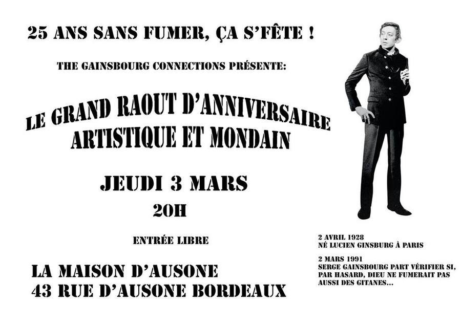 Une soirée 100 % Serge Gainsbourg, à l’occasion des 25 ans de sa fuite vers les volutes célestes. Sur scène, le trio The Gainsbourg Connections, et de nombreux collègues et amis artistes de tous horizons qui viendront interpréter des titres du célèbre compositeur.Charlie Dales, la chanteuse du groupe de soul Foolish King, Zo l'Anar et sa nouvelle formation picaresque les Ostrogoths, Marc Delmas qui fera revivre un titre absolument introuvable du maestro, Anne Sajous, Guillaume Lacampagne, Clémentine Dosgilbert, le chercheur Olivier Sigaux fera une petite déambulation artistique autour du roman Euvgénie Sokolov, etc...