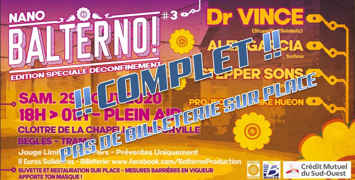 Crise Covid19 oblige, le Festival Balterno! 2020 qui devait avoir lieu les 10 et 11 juillet au parc Mussonville a été annulé. La vie reprend maintenant peu à peu son cours et l'équipe de Balterno Production a imaginé des projets de secours, avec l'aide de la ville de Bègles et l'équipe de Bègles Culture (Merci à eux!)