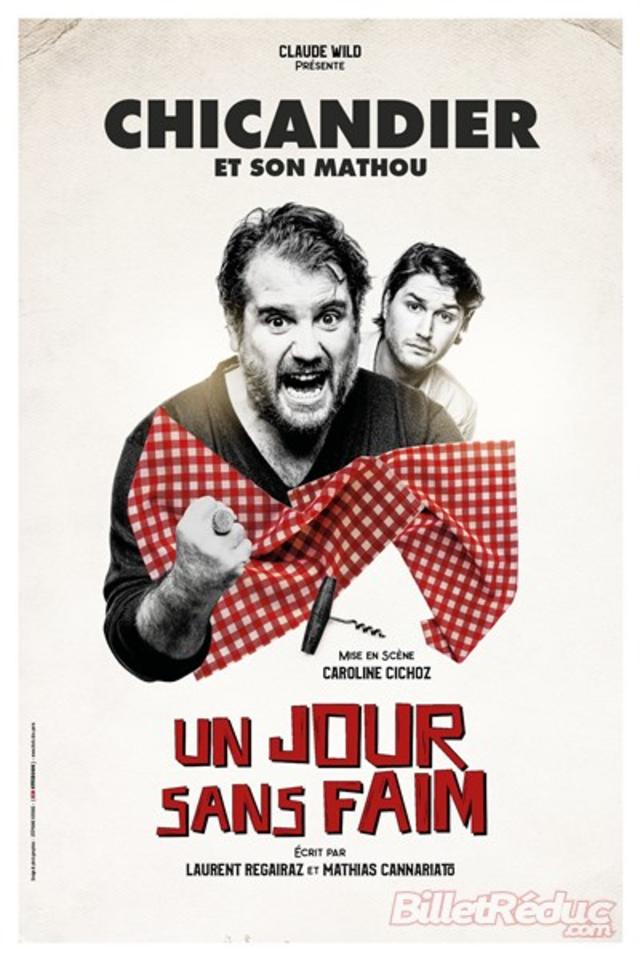Chicandier et son mathou dans "Un jour sans faim". Chicandier, marié, des gosses, la quarantaine, un peu trop "bon vivant"... pour pas dire obèse et alcoolique... se pose des questions sur la vie : le couple, le boulot, le sens de la vie ! Continuer à s'autodétruire mollement ou se mettre un maillot à pois comme ces connards de cyclistes ? Il est accompagné, dans ses atermoiements, par Mathou, son ami de toujours qui va tour à tour jouer les personnages qu'il croise dans sa vie ! Entre Blier, Marielle et le gras d'jambon, c'est l'aventure d'un homme fatigué...à deux doigts du break-down !
