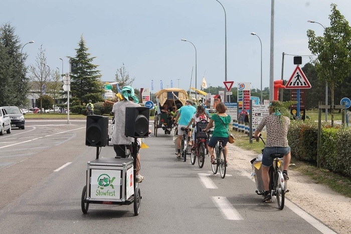 Cyclo-balades musicales, patrimoniales et décarbonées, prenant le contrepied des grosses machines festivalières énergivores, les _Slow parades_ s’inscrivent dans nos paysages en alternant les moments contemplatifs et festifs. Escortés par la mini-flotte du biclou sound system (sono solaire cyclo-tractée !), les festivaliers s’ambiancent à l’énergie communicative d’une fanfare techno décroissante, d'un duo de folk américaine ou d’une diva rock’n roll entre autres DJ’s et MC's. Inspirant !