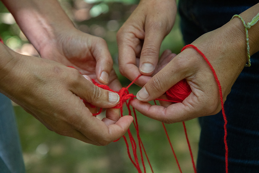 Dans un paysage de fils visibles et invisibles, d’attaches nouées ou déployées, un brin de mémoire suspendu à des cartographies, 2 comédiennes chantent… arpentent et revisitent un territoire inscrit dans les corps au fil du temps. Elles racontent, dans un mélange de langues et de langages, oral, corporel, musical, un échange gourmand et espiègle, le tissage d’un lien, l’épreuve de sa résistance : le lien qui peut unir une petite-fille et sa grand-mère. Un lien qui se fait berceau et berceuse, couverture et parachute, refuge ou piste de danse. L’ouverture d’une voie pour se comprendre, s’entendre d’une rive à l’autre du ruisseau, d’un versant à l’autre de la montagne ou de la vie.