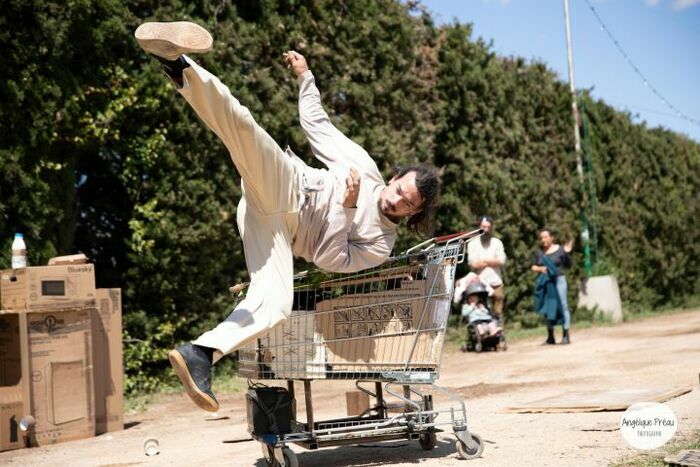 Un homme en costume élimé pousse un caddie de supermarché. Il s’assied, allume une radio, déploie un cirque de récup’, met la lumière sur un monde de la marginalité. Assise vacillante et équilibres précaires, Cyril Toulemonde arpente son mât chinois dans les positions les plus improbables. Ses mouvements maladroits et acrobatiques s’allient à un numéro de clown tendre, pas très loin de Charlot. Dans cette symphonie de rouille et de cartons, c’est toute notre société de que l’artiste fait trembler avec malice et légèreté. Comme un reste d'espoir, de simplicité, de soutien et de partage dans ce "monde dystopique" où l'homme et la planète s’essoufflent sous le poids de la surconsommation.