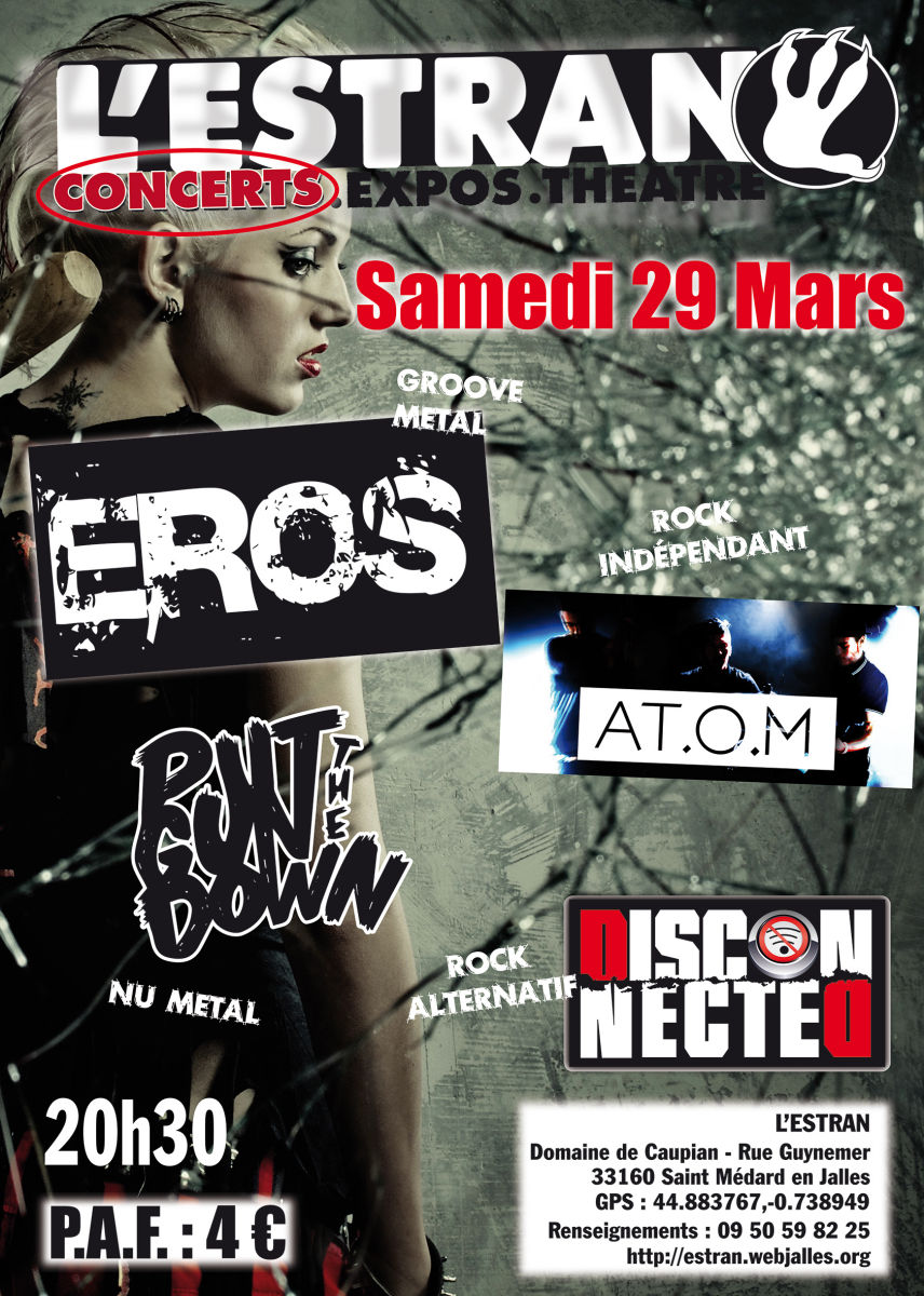 EROS : La tête d'affiche de cette soirée. Du Groove Metal porté par la voix puissante d'une chanteuse charismatique, des sons et des riffs de guitare en acier trempé, un basse batterie irréprochable pour assoir le tout. What else ? Il faudra être là pour le savoir.