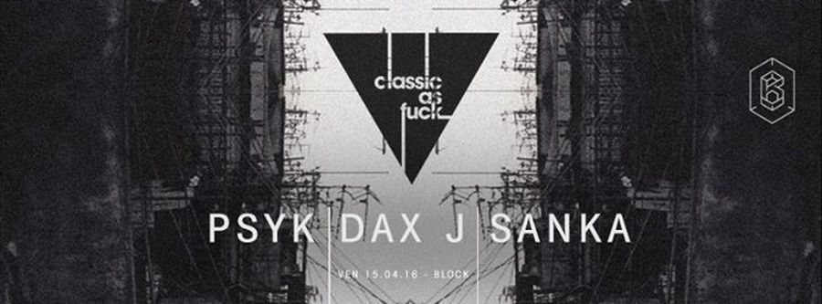 Classic As Fuck est de retour sur Bordeaux après des passages très remarqués en compagnie de Ben Klock, Martin Eyerer, Hans Bouffmyhre et bien d’autres.Le collectif revient cette fois-ci @ Block avec deux missiles de la scène internationale - L’espagnole Psyk, boss du Label NON series et l’anglais Dax J, patron du label Monnom Black. Ils seront accompagnés du Bordelais Sanka pour une soirée mémorable.
