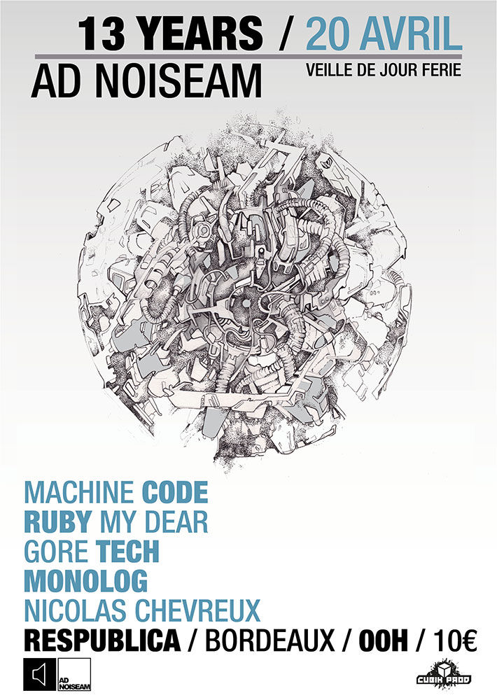 Avec Gore Tech (deathstep / Ad Noiseam / Berlin) + Monolog (drum and bass - électronica / Ad Noiseam / Berlin) + Ruby My Dear (breakcore – drill'n'bass / Ad Noiseam - Peace Off / Toulouse) + Machine Code (neurofunk - breakcore / Ad Noiseam / Berlin) + Nicolas Chevreux