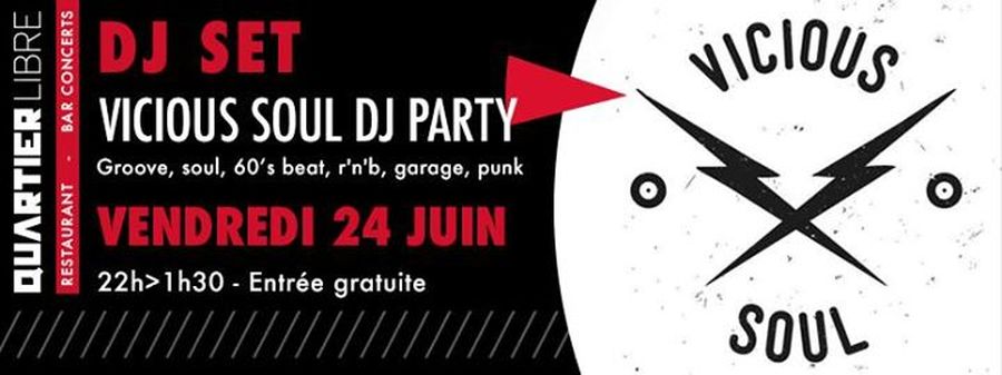 Vicious Soul vous convie, tous les derniers vendredis du mois au Quartier Libre. Association active sur Bordeaux et ailleurs depuis 2008, la team DJ prend un malin plaisir à sonder les âmes danseuses qui sommeillent en chacun de nous. Les explosives, les contenues, les contrariées finissent en une libération collective qui prend vie sur le dancefloor. A force de chiner à St Mich’ ou ailleurs, les lourdes galettes noires qui ont fait leurs preuves depuis plus d’un siècle, seront concentrées en nombre sur la scène pour vous ravir de pépites 50’s 60’s voire au-delà. Du Rhythm and Blues, du Rock’n’Roll, de la Soul, du 60’S Beat en passant par le yéyé, les vieux sons sont à l’honneur et chacun peu y trouver son compte, son morceau d’accroche, et se laisser porter par l’ambiance et l’ivresse jusqu'à plus soif. Une vielle formule donc, qui n’est jamais réellement tombée en désuétude. Vos sélecteurs DJ Face B, Raolina, Vos Dents, Greffier et C’ James vous attendent en nombre et en force pour laisser libre court à vos parts sombres et nocturnes, joyeuses et festives.