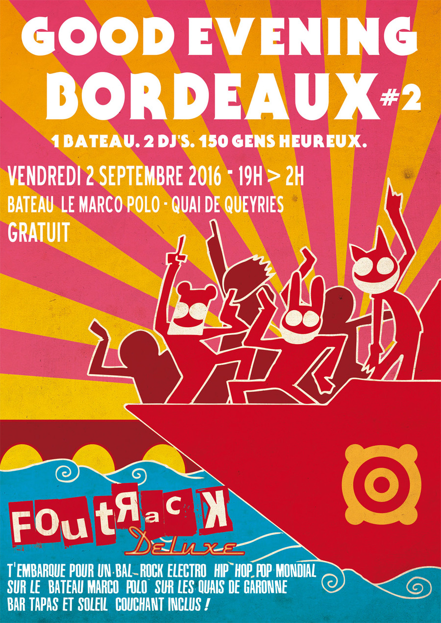 Foutrack Deluxe et le bateau Marco-Polo Bordeaux remettent ça le vendredi 2 septembre pour une redescente climatisée vers la fin des vacances: un bal Rock Electro Hip-Hop Pop mondial sur le pont du bateau, de l'apéro jusqu'à tard!