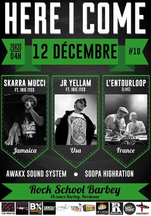 Rendez-vous le 12 décembre pour la dernière Here I Come de l'année. Venez fêter ça avec SKARRA MUCCI, célèbre toaster Jamaïcain de renommée internationale au flow unique et imparable dont le nouvel album "stronger than strong" à déjà fait le tour du monde. Passé au Reggae Sun Ska il y a deux ans sa prestations incroyable et son flow implacable ont retourné le festival. A ses cotés le prometteur JR YELLAM, artiste émergent de la scène reggae française qui s'est produit notamment aux côtés de Chezidek, Naâman, Dawn Penn... Le célèbre sound system IRIE ITES sera évidement de la partie pour ambiancer le dancefloor à grands coups de dubplates et de classiques.