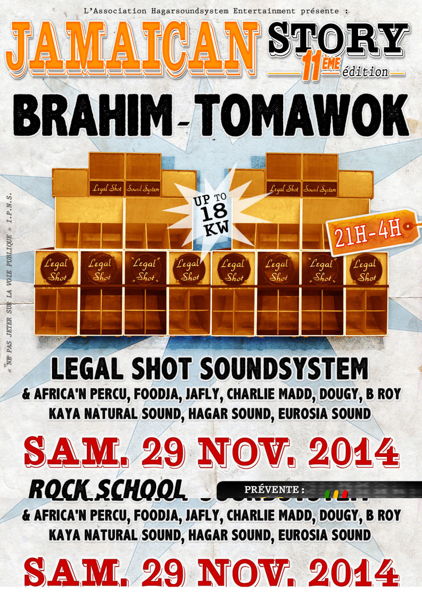 Une grosse soirée qui s'annonce à Barbey pour tous les fans de Reggae Music et de Grosses Basses : une soirée sur 2 niveaux (Grande Salle et Club) avec la SONO du LEGAL SHOT SOUNDSYSTEM (8 scoops – 2 Stacks - Up to 18 KW) que vous avez certainement déja croisé sur le Dub Corner du Reggae Sun Ska , du Rototom ou des soirées Dub me Crazy ... entre autres... Au micro vous retrouverez BRAHIM , artiste confirmé et présent dans les Soundsystem depuis 90', il n a jamais laché le micro et viendra nous présenter son nouvel album et ses succès tant appréciés " BIG Tunes!!!" . TOMAWOK ,un artiste en pleine ascencion, sera également présent pour distiller ses paroles dans différents styles mais toujours dans un esprit Ragga muffin et avec une énergie débordante; ainsi que nos fidéles chanteurs du Bordoline Crew (B Roy, Charlie Madd, Dougy...). Au niveau des sélections Kaya Natural Sound Crew , Selecta Hagar et le Legal Shot vous ont préparé des sets explosifs : Roots , Rub a Dub , Digital & Steppa Style... de quoi se mettre bien jusqu'à 4 h du matin.