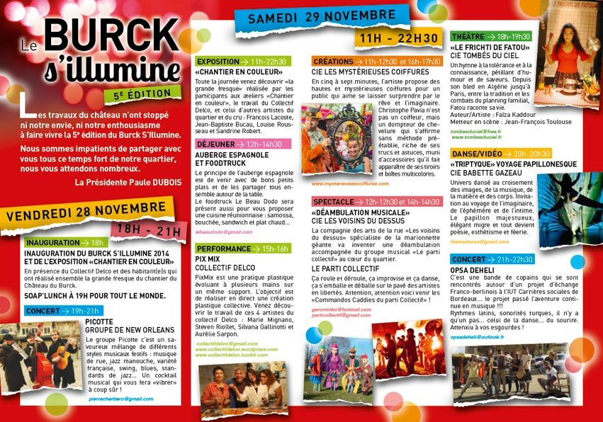 L’Association Tournesol vous présente la 5ème édition de l’évènement « LE BURCK S’ILLUMINE » Cet évènement aura lieu le Vendredi 28 novembre et Le Samedi 29 Novembre 2014 sur le quartier du Burck à Mérignac (33). Un week-end de festivités autour des arts plastiques (exposition, performance..) et des arts vivants (marionnette, fanfare, théâtre, danse, vidéo, concert…).