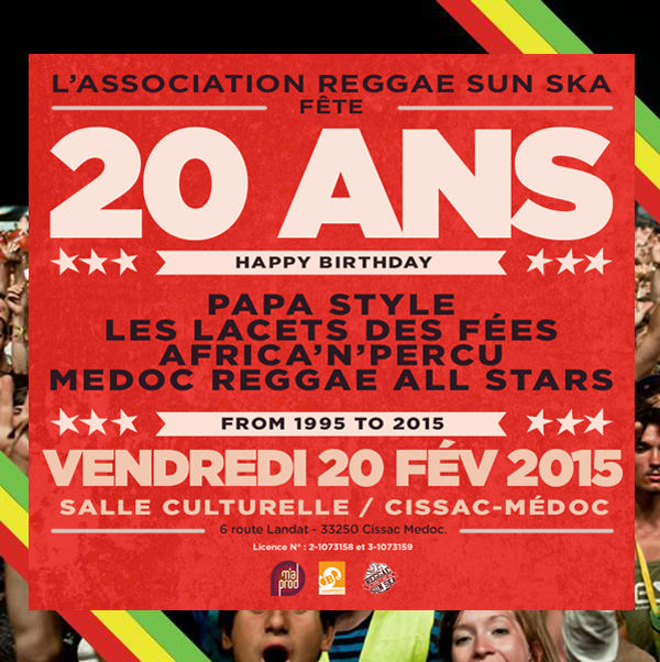 Le mois de Février 2015 annonce les 20 ans de l’association Music Action, créée en 1995 à Cissac Médoc. De concerts en concerts et de projets en projets, elle est devenue l'Association Reggae Sun Ska. 20 ans c’est le bel âge ! L'occasion de fêter toutes ces années de travail, de passion et de musique. Nous serons bien entourés puisque des groupes médocains seront à l'honneur avec Les Lacets des Fées ou encore Africa'N'Percu. Nous accueilleront aussi une des grands ficgures du reggae français qui fait maintenant partie de la famille depuis plusieurs années, Papa Style et son flow inimitable !