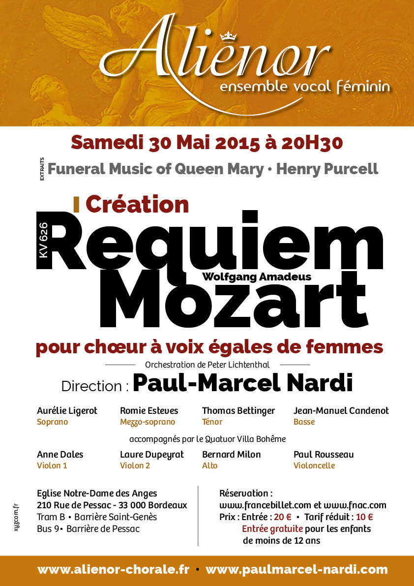 L'Ensemble Vocal ALIENOR est dirigé par Paul-Marcel NARDI et accompagné par le Quatuor Villa Bohême: transcription minutieuse pour choeur féminin et orchestration pour quatuor à cordes de Peter Lichtenthal réalisée en 1811.