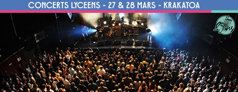 Comme tous les ans, le Krakatoa accueillera les concerts lycéens sur deux soirées, au bénéfice d’une association caritative. Cette année les concerts auront lieu les 27 et 28 Mars. L’idée est de faire jouer en conditions professionnelles des groupes plus ou moins débutants, dans lesquels se cachent souvent des perles! Tous les bénéfices des soirées reviendront à une association caritative.
