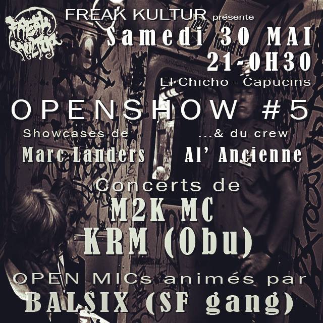 15 ème soirées du collectif bordelais FREAK Kultur... Venez participez aux Open Mics animé par Balsix, avec toujours de nouveaux groupes Hip-hop à découvrir ou à redécouvrir: Marc Landers(JNS), le crew Al'Acienne, les Mc KRM et M2K, ainsi que leurs invités - 4 euros