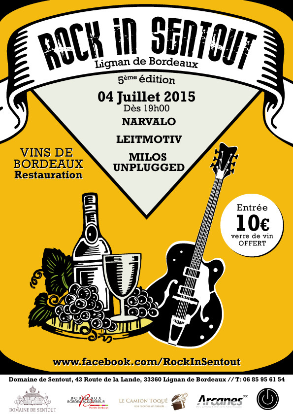 5ème édition de Rock in Sentout à Lignan de Bordeaux, dans l'Entre-deux-Mers. Premier Festival Rock et Vin dans un domaine viticole, le Domaine de Sentout. Au plaisir de vous accueillir !! Bien à vous, Nicolas et Karina Pons, vignerons récoltants. Renseignements: 06 85 95 61 54. Suivez l'événement sur facebook: www.facebook.com/RockInSentout