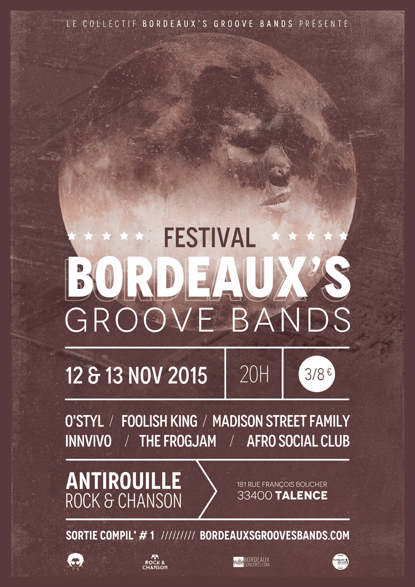 Après le succès des « Bordeaux's Groove Parties » qui avaient fait groover le Saint-Ex, l'Heretic ou encore le Booboo'zzz Club de 2011 à 2014, le collectif Bordeaux's Groove Bands investit l'Antirouille Rock & Chanson à Talence pour deux soirées Live à l'occasion de la sortie de sa 1ère Compilation :