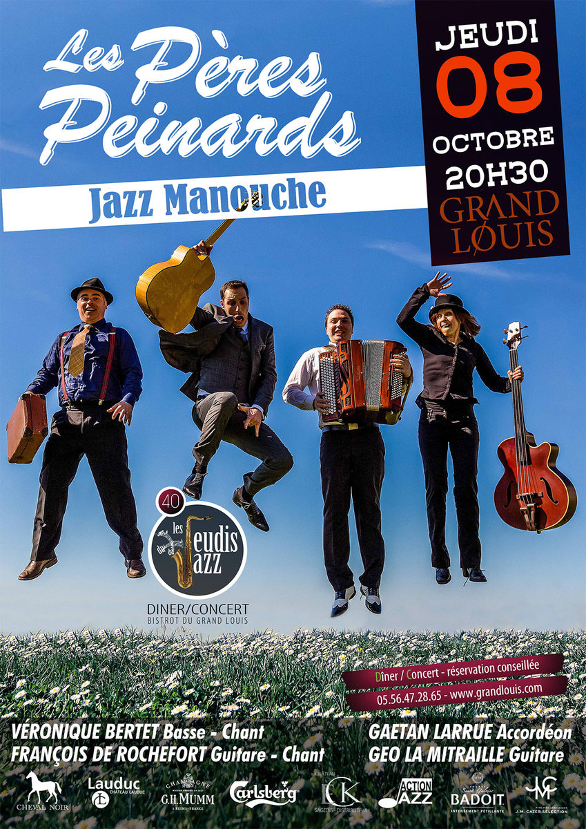 Emmenés par Gaétan Larrue à l’Accordéon, Geoffroy Boizard à la guitare solo, François de Rochefort à la guitare et au chant, Véronique Bertet à la Basse et au chant et Marius Turjanski au violon, les Pères Peinards vous font découvrir un univers musical touchant et virtuose ou le jazz et la chanson croisent le fer dans un décor et une ambiance que ne renieraient pas les héros d’Audiard et de Lautner … Les Pères Peinards sont une vraie famille et vous invitent à leur table à partager leur univers musical et leur passion pour le jazz acoustique, la musique de Django Reinhardt, la culture française et le bon vivre.