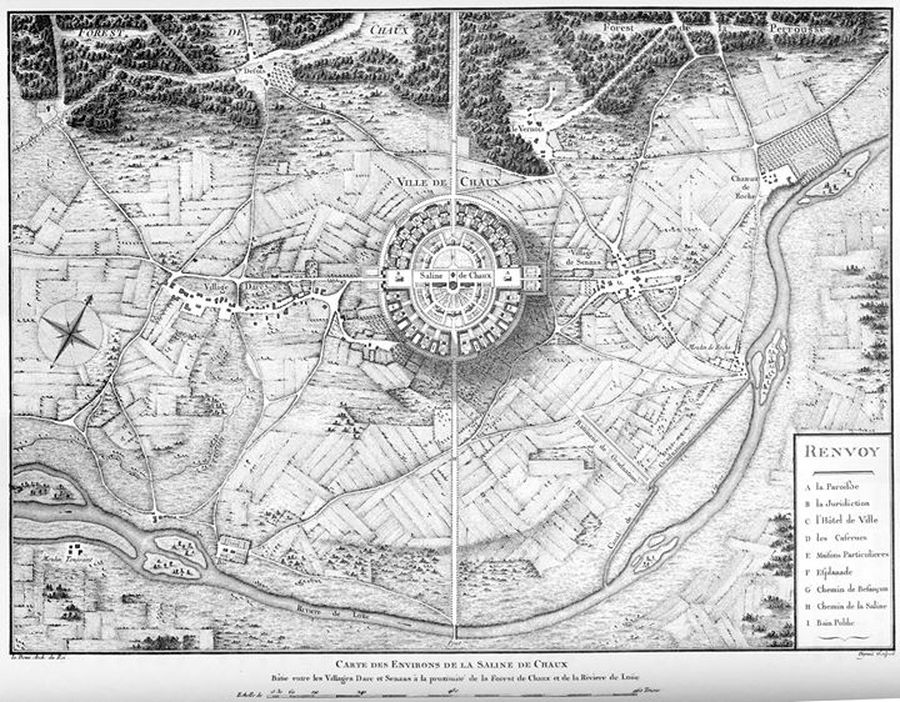 Légende : © La Saline royale d’Arc-et-Senans construite par l’architecte Claude-Nicolas Ledoux. Carte générale des environs de la Saline de Chaux. Planche 14 de « L’architecture considérée sous le rapport de l’art, des mœurs et de la législation », Paris, 1804.’